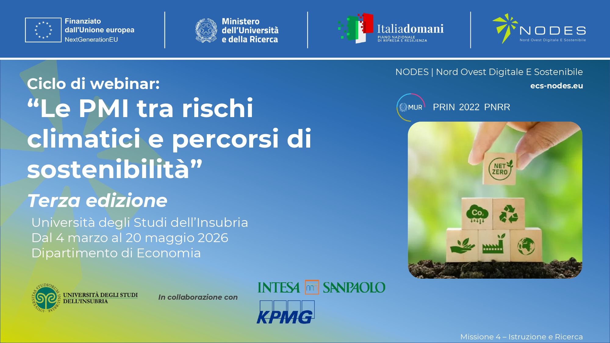 Il ciclo di webinar “Le PMI tra rischi climatici e percorsi di sostenibilità” affronta il tema della transizione sostenibile delle piccole e medie imprese nel contesto delle sfide poste dal cambiamento climatico. Gli incontri analizzano gli impatti dei rischi climatici sui sistemi economici e sulle attività produttive, nonché le implicazioni per le strategie aziendali, l’accesso al credito e i processi di rendicontazione della sostenibilità.